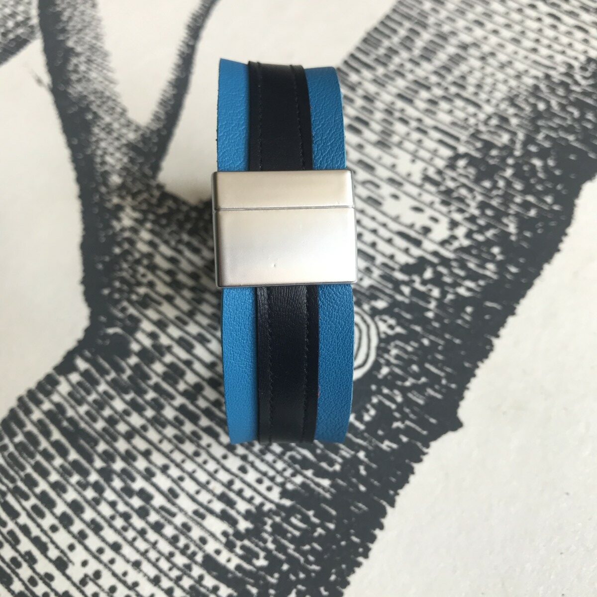 Bracelet cuir manchette bleu azur bleu marine, fermoir aimanté. Faites vous un cadeau personnalisé. Artisanat Made in France. Bracelet pour les femmes, cavalières passionnées et ayant du style. Offrez un cadeau à vos supportrices (Maman?), groom et coach d’équitation préférés.