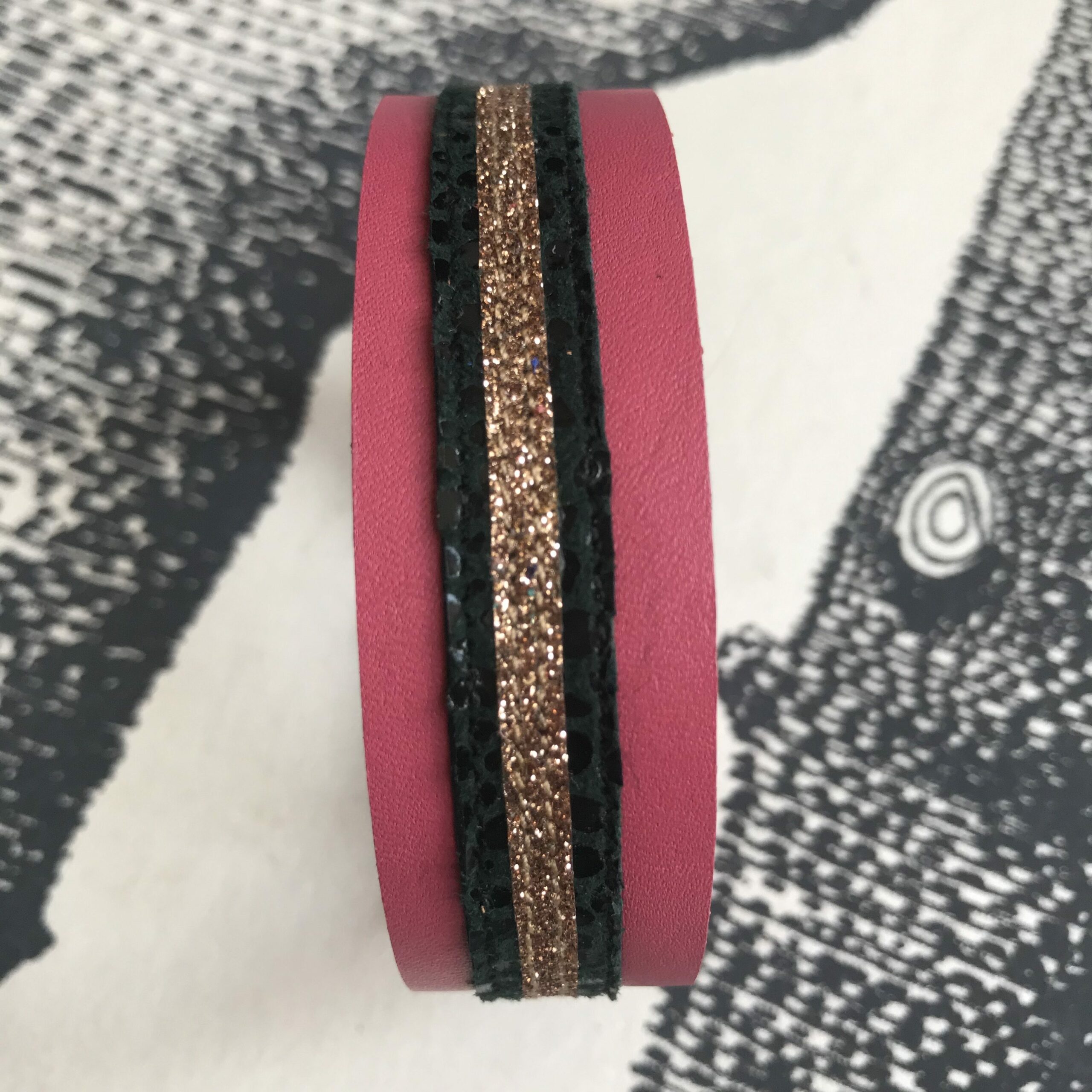Bracelet cuir manchette rose, vert, paillettes or. Cavaliers, cavalières, faites vous plaisir avec les bracelets cuirs personnalisées pour celles et ceux qui ont du style à cheval comme à la ville. Ce bijou vous accompagnera en journée comme en soirée. Choisissez l’artisanat et la fabrication Française.