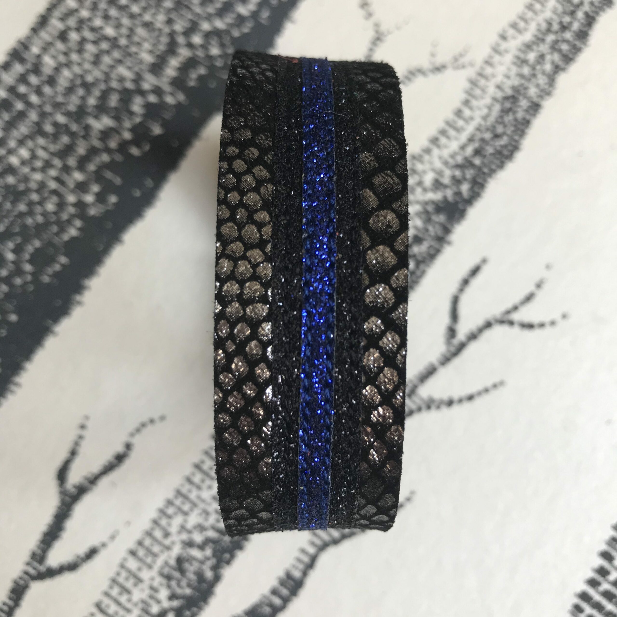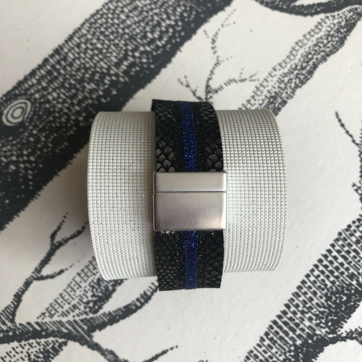 Bracelet cuir manchette serpent argenté noir paillettes bleu vif, monté sur un joli fermoir aimanté. Tous les bracelets sont de fabrication artisanale made in France dans la région lyonnaise.