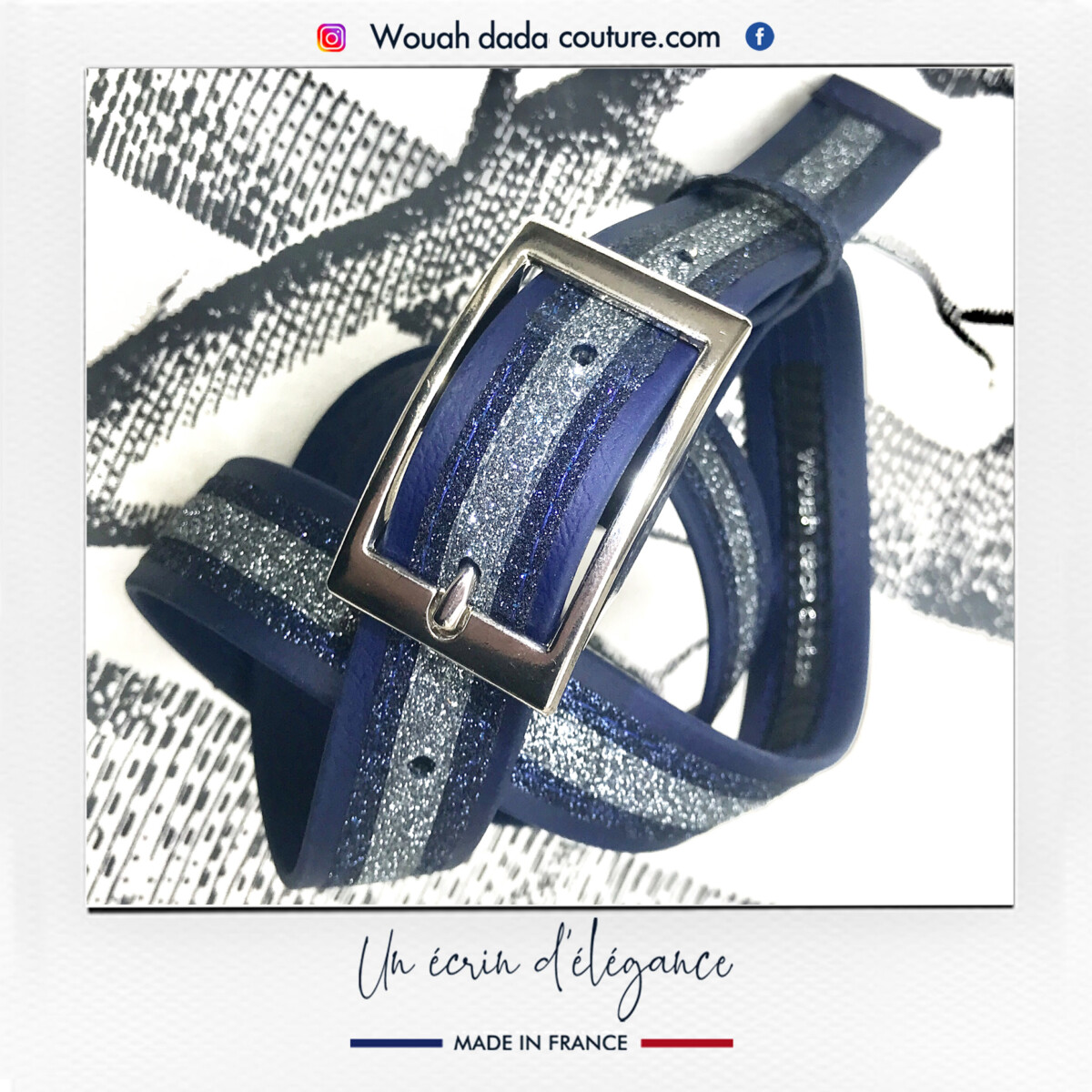 Ceinture équitation bleu marine en biothane et paillettes bleu nuit argent foncé![]()