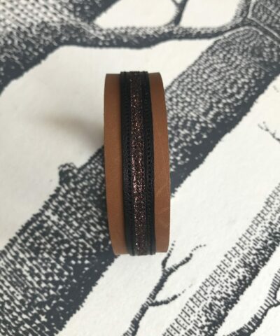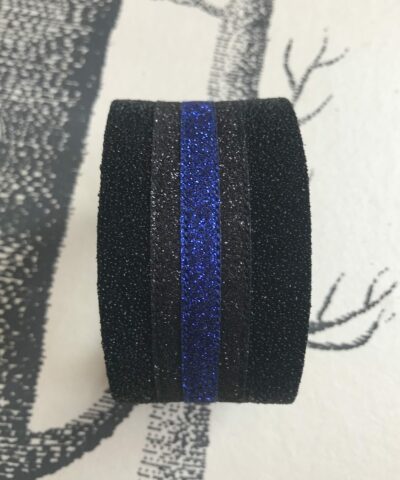 Les galons de paillettes sont découpés par mes soins, collées avec une colle souple pour épouser parfaitement la courbe du bracelet puis cousues: 4 coutures tout le long des paillettes pour garantir une meilleure finition.