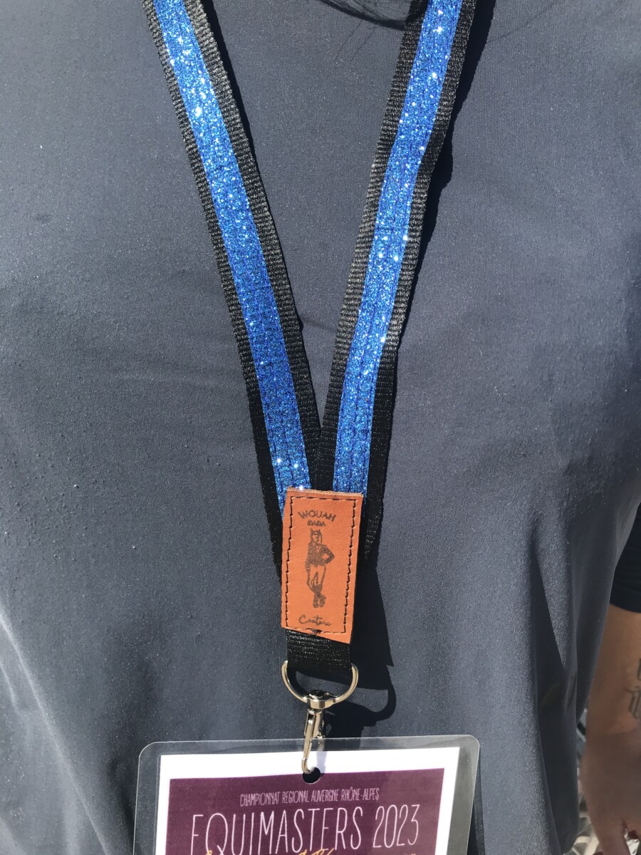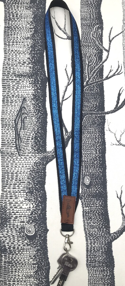 Dragonne- tour de cou noir à paillettes bleu vif  pour clé, badge, téléphone