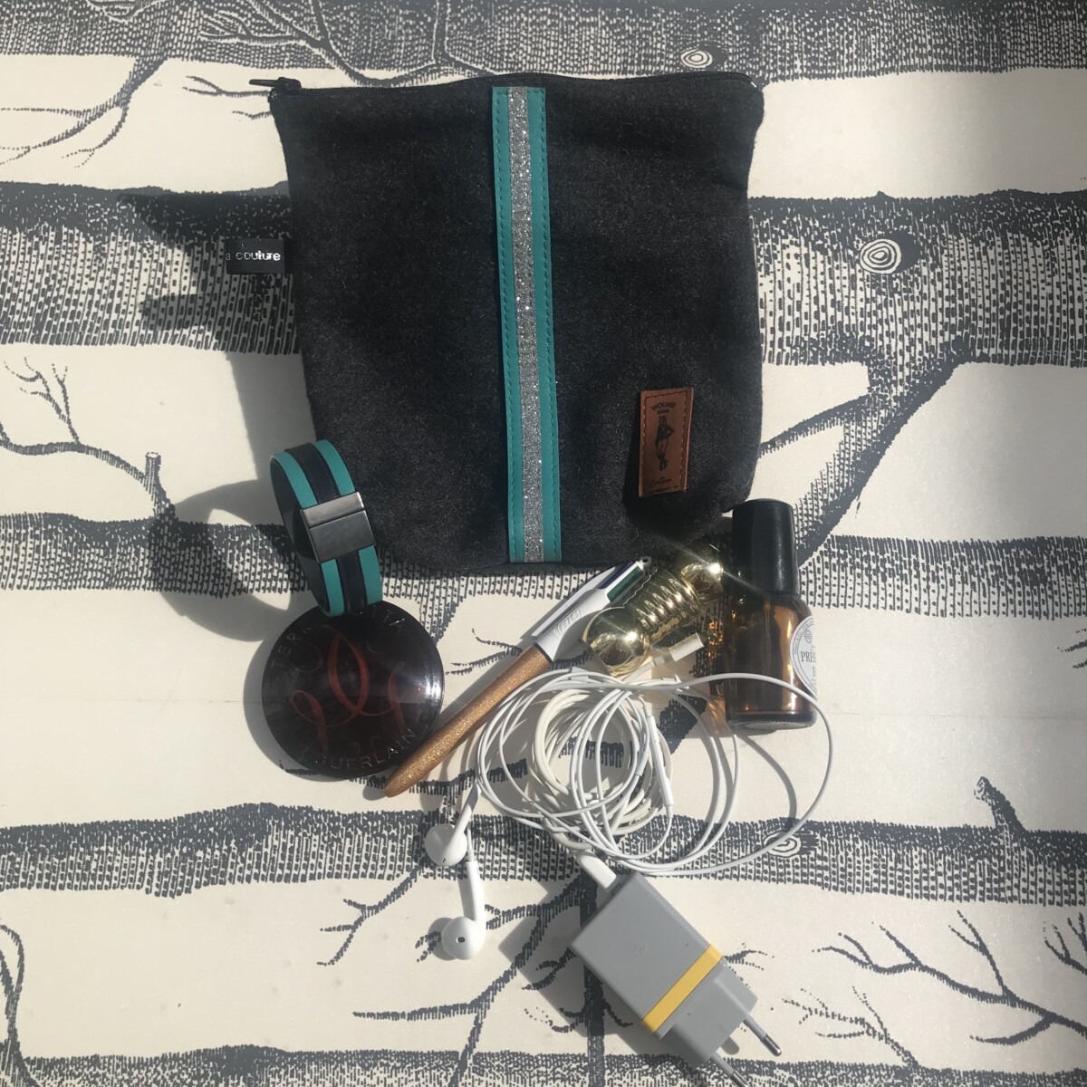 trousse grise/ galon cuir émeraude/galon pailleté gris clair