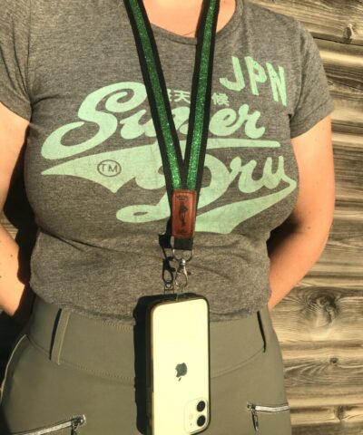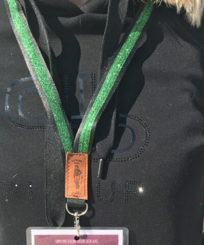 Dragonne- tour de cou noir à paillettes vertes pour clé, badge, téléphone